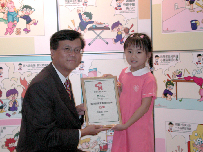 宏利人壽保險(國際)有限公司高級副總裁兼香港區總經理劉允剛先生頒獎予亞軍得主余詠欣小朋友