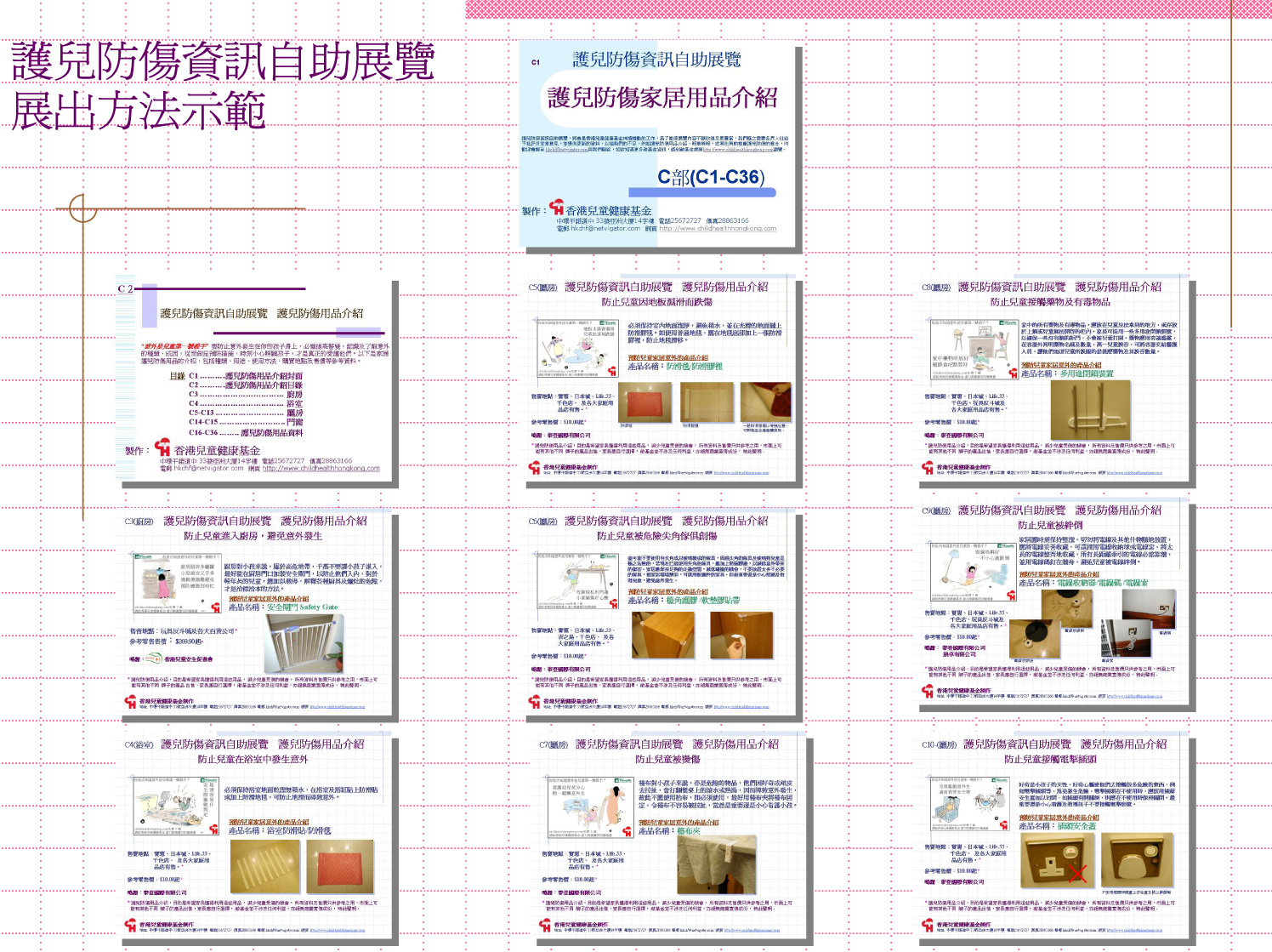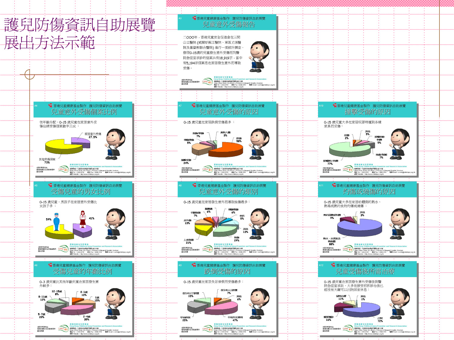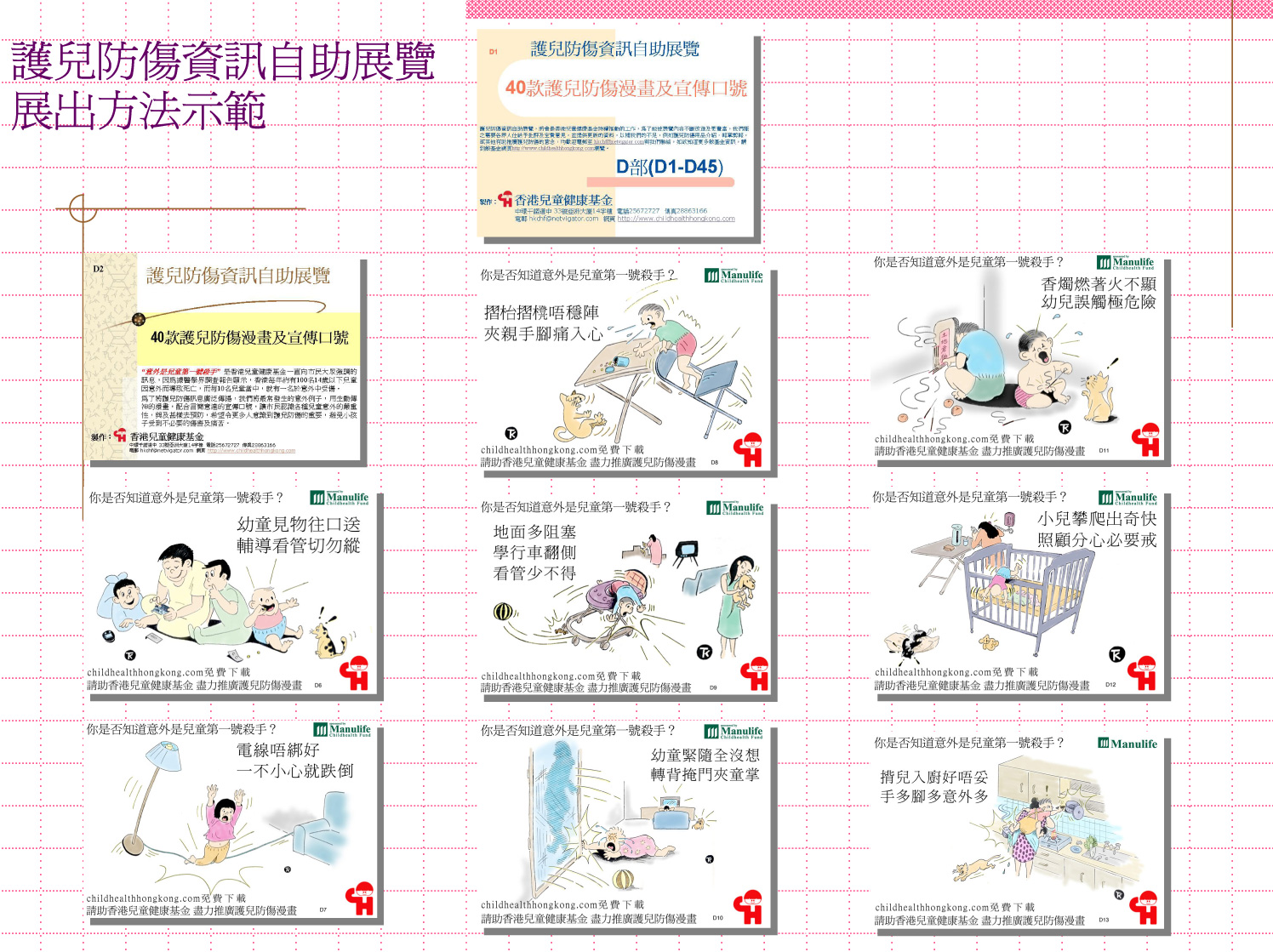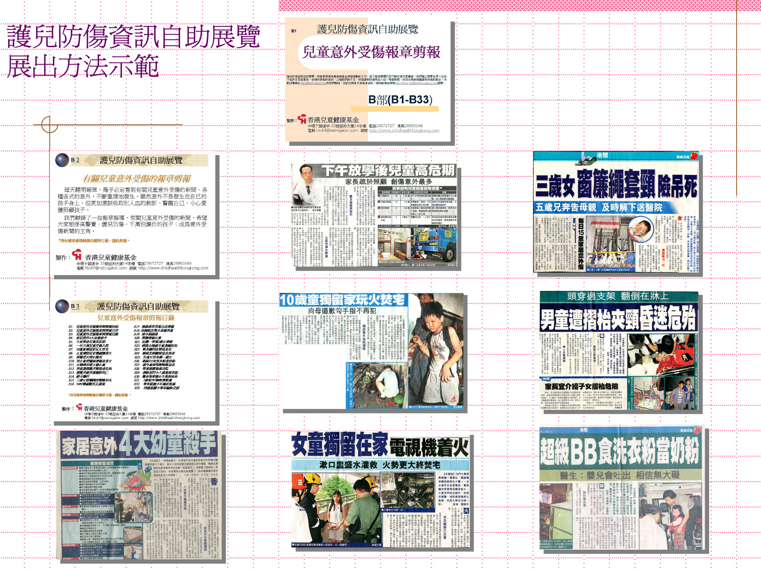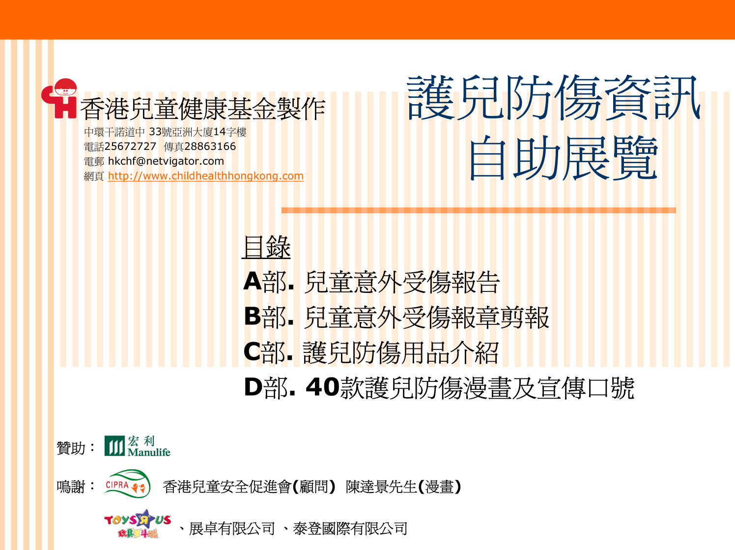 | 護兒防傷資訊自助展覽 01. 護兒防傷資訊自助展覽介紹 A. 兒童受傷報告 (往主頁瀏覽) 下載A部分完全版 B. 報章剪報 (往主頁瀏覽) 下載B部分完全版 C. 護兒防傷用品介紹 (往主頁瀏覽) 下載C部分完全版 D. 護兒防傷漫畫 (往主頁瀏覽) 下載D部分完全版