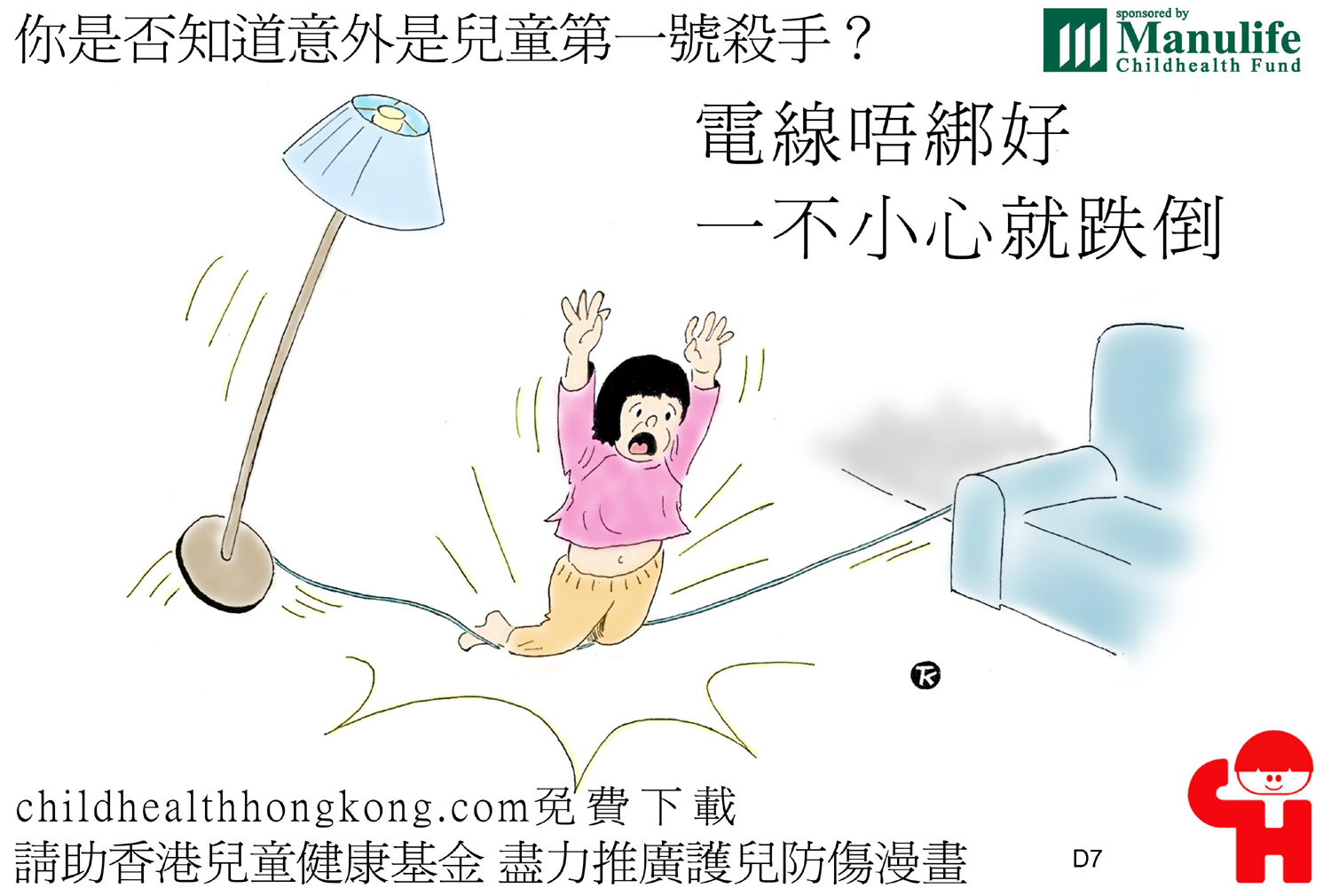 護兒防傷漫畫及宣傳口號 (電線唔綁好, 一不小心就跌倒)