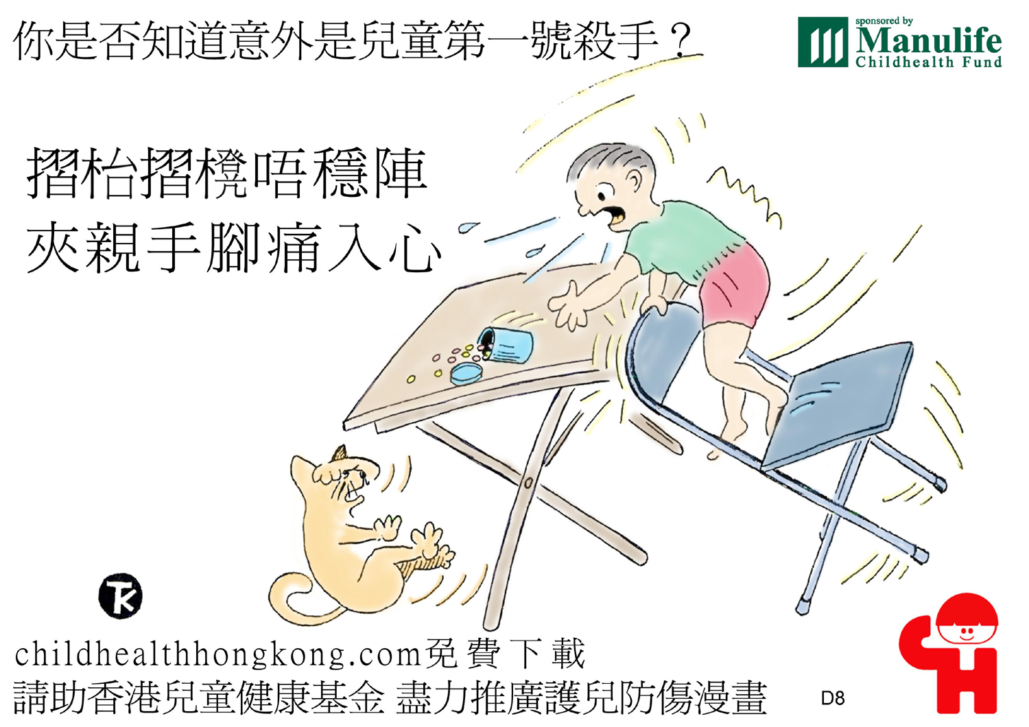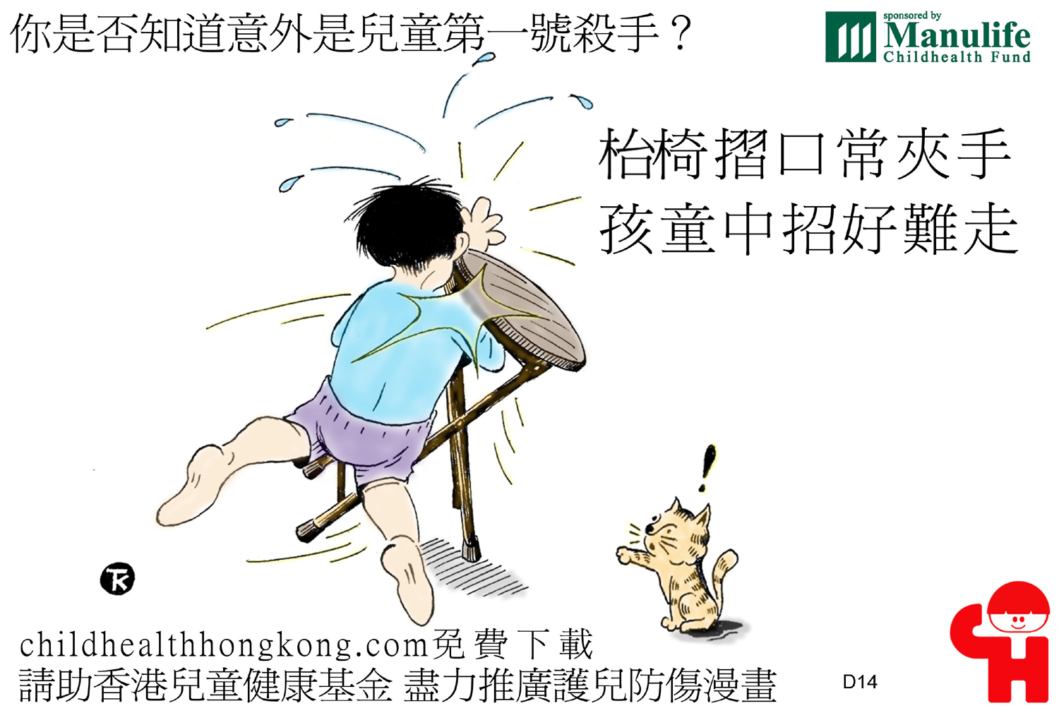護兒防傷漫畫及宣傳口號 (檯椅摺口常夾手 孩童中招好難走)