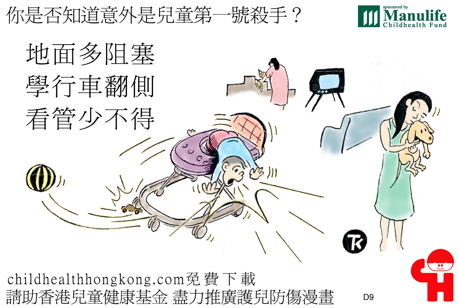 護兒防傷漫畫及宣傳口號 (照顧小兒莫分心, 一不留神就跌親)