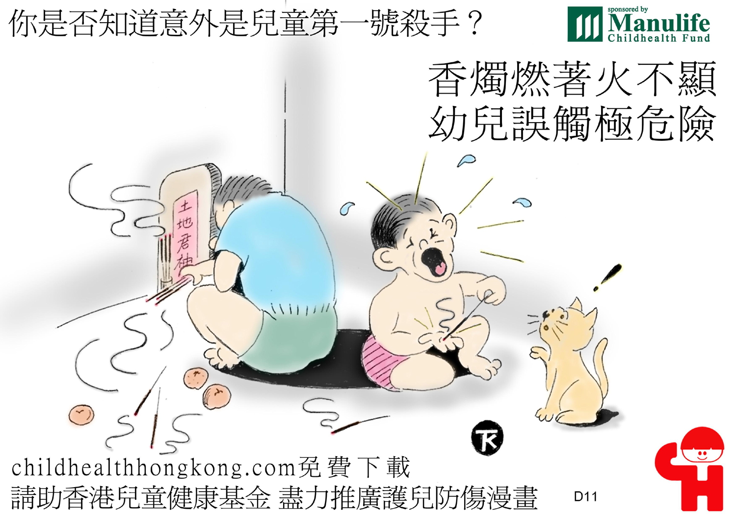 護兒防傷漫畫及宣傳口號 (香燭燃著火不顯 幼兒誤觸極危險)