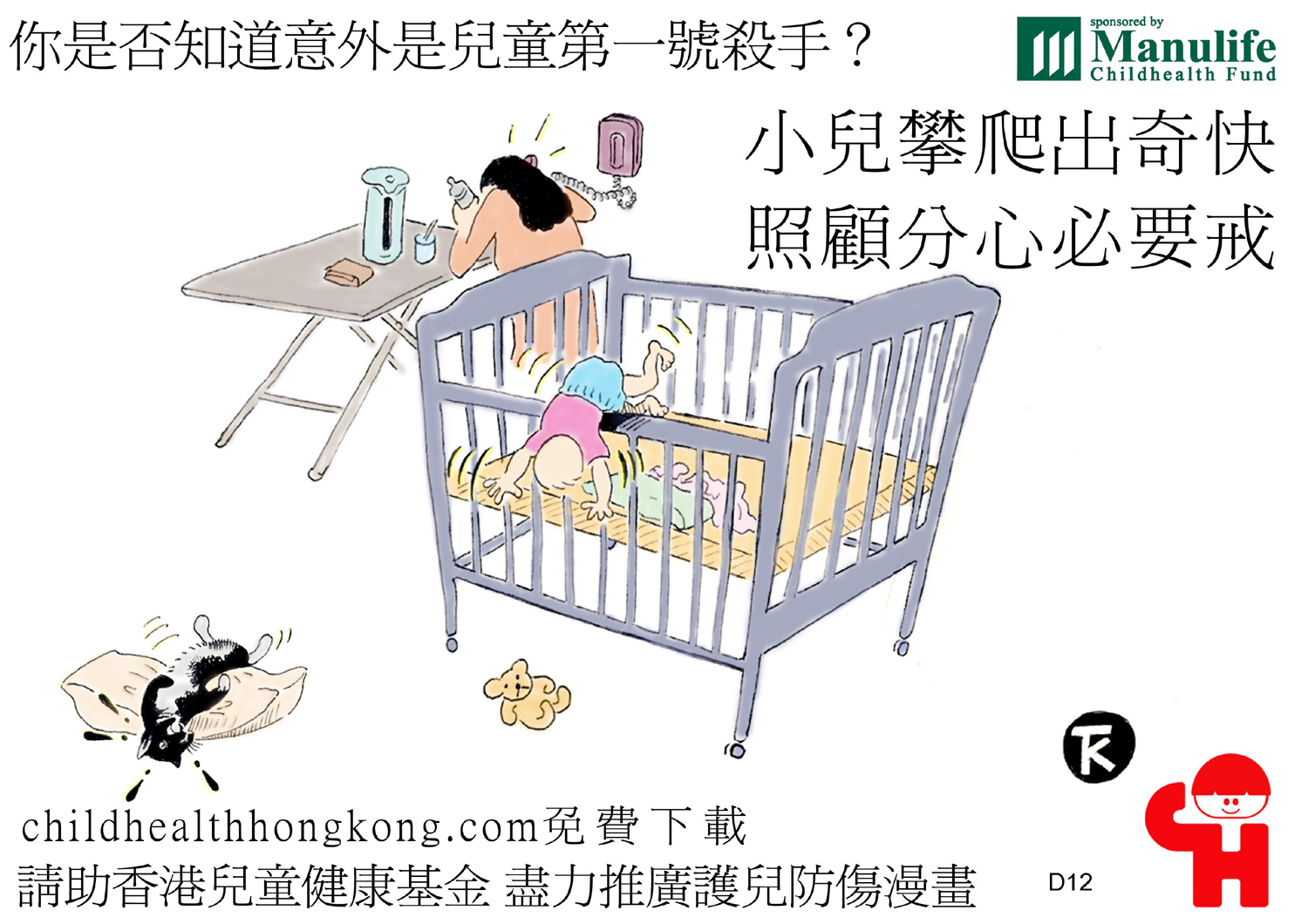 護兒防傷漫畫及宣傳口號 (幼兒翻爬工夫來得早 穩妥安置計劃先做好)