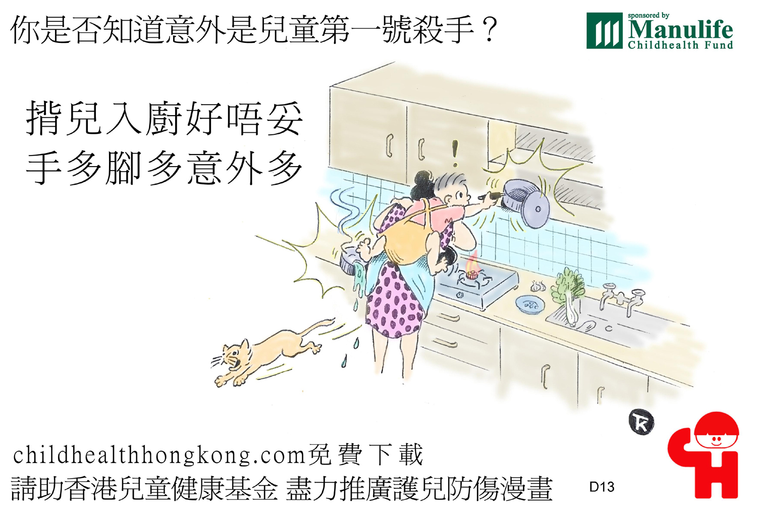 護兒防傷漫畫及宣傳口號 (揹兒入廚好唔妥,手多腳多意外多)