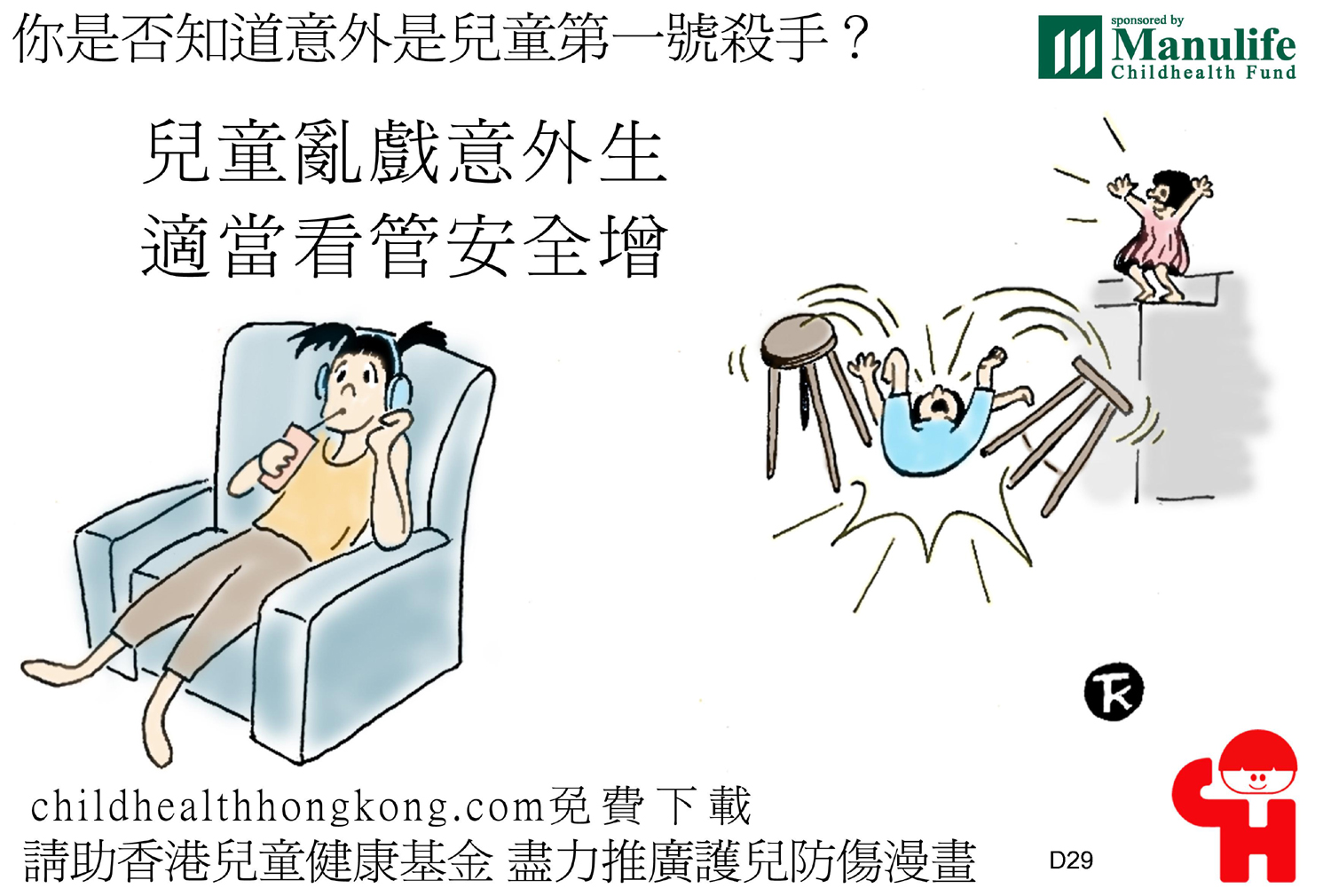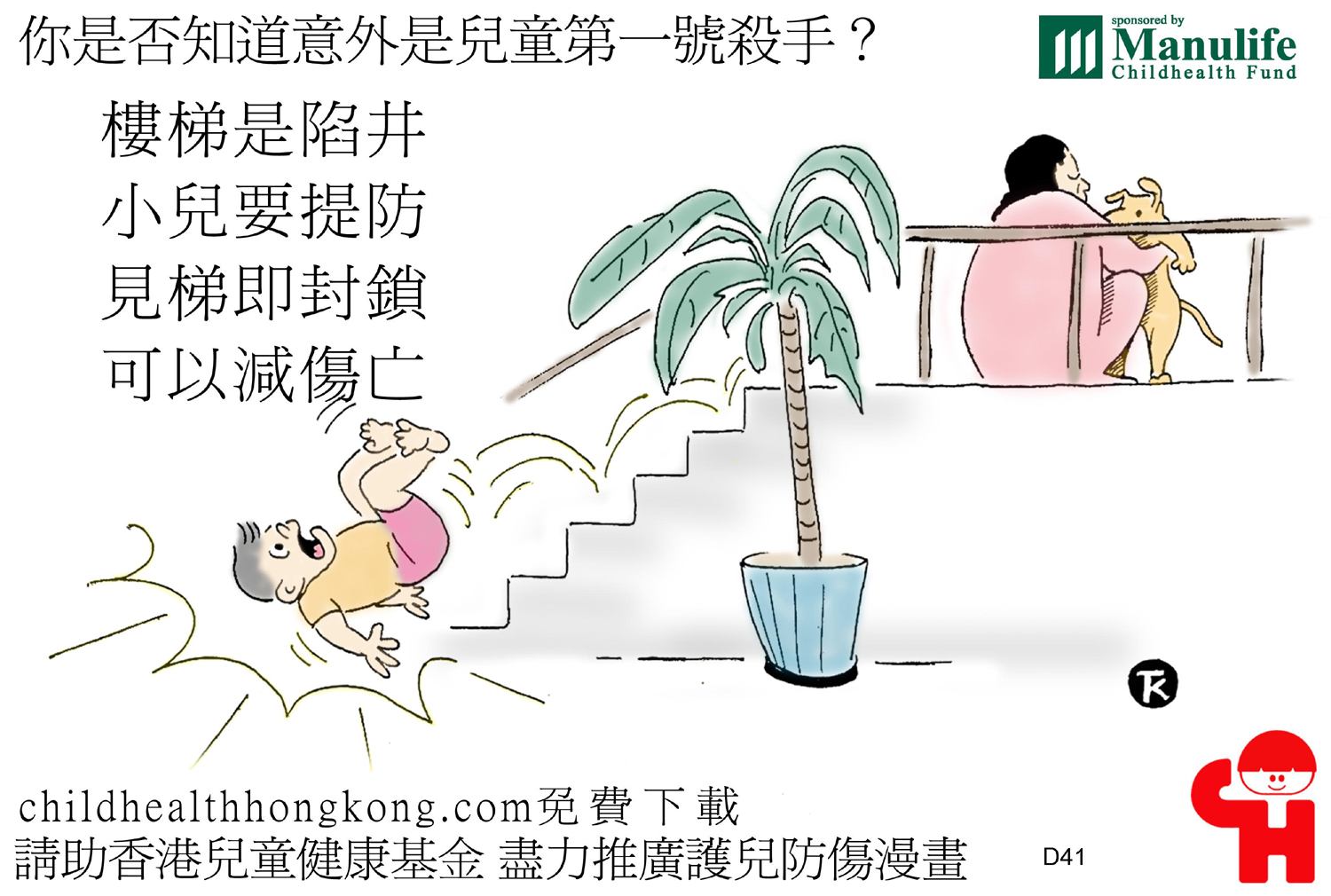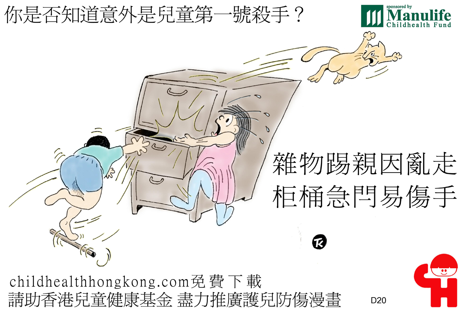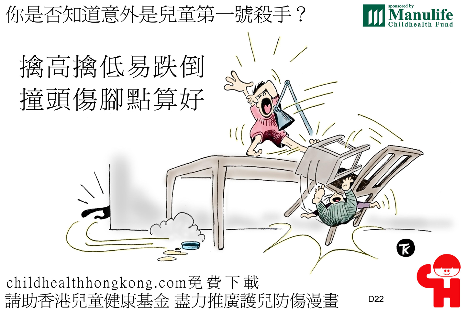 護兒防傷漫畫及宣傳口號 (擒高擒低易跌倒, 撞頭傷腳點算好)