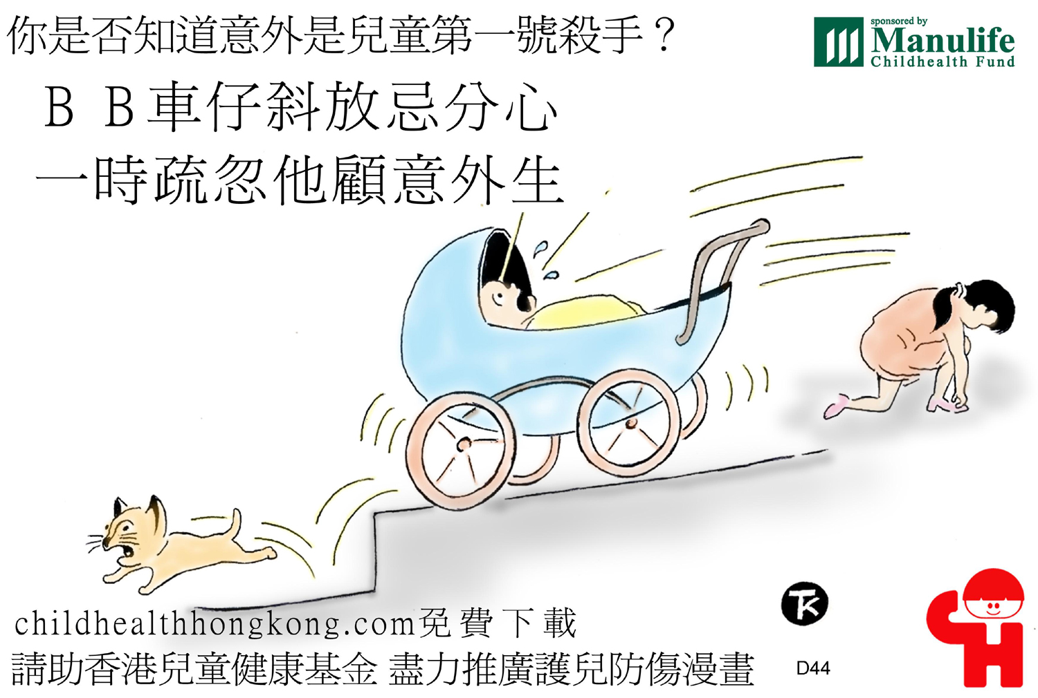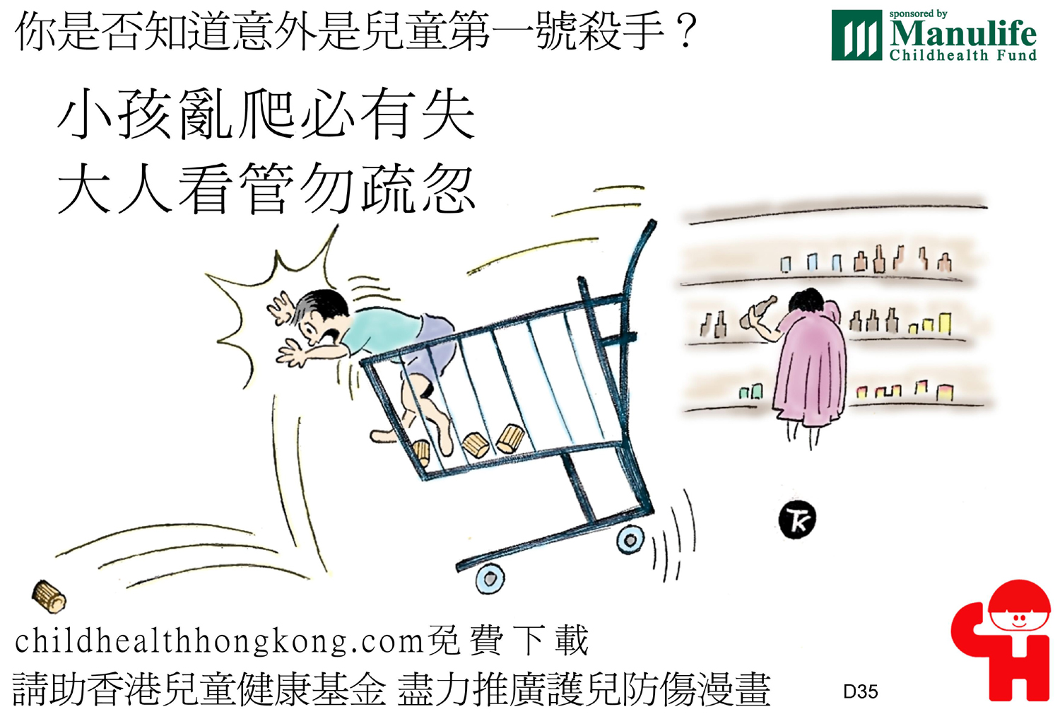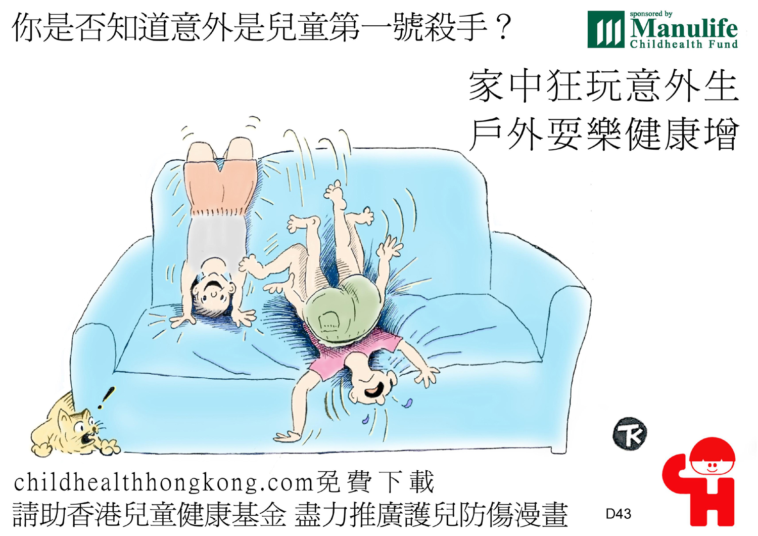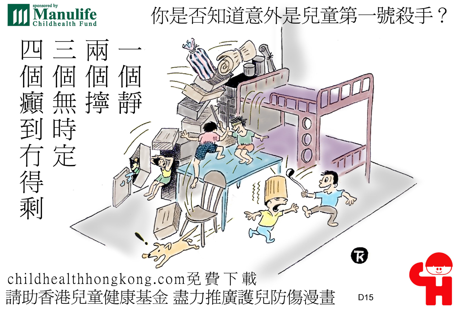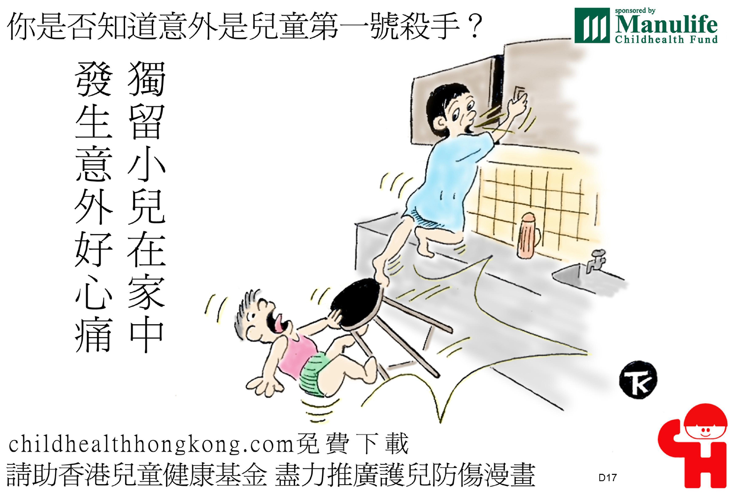 護兒防傷漫畫及宣傳口號 (擒高擒低易跌倒, 撞頭傷腳點算好)