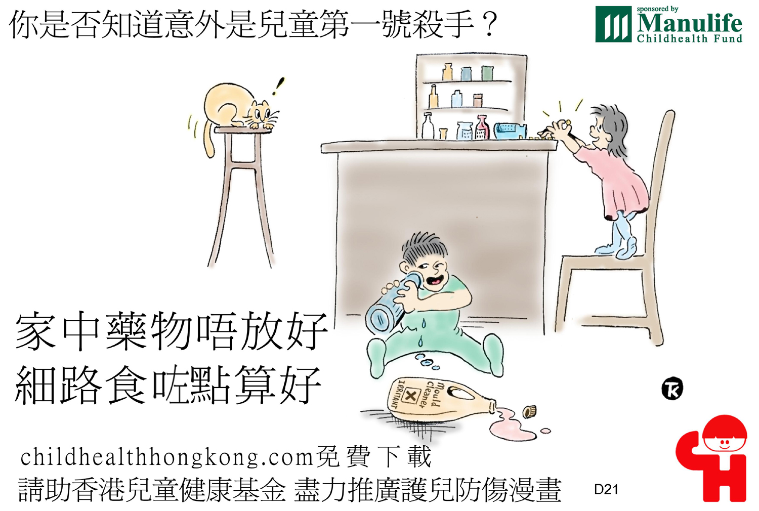 護兒防傷漫畫及宣傳口號 (家中藥物唔放好, 細路食0左點算好)