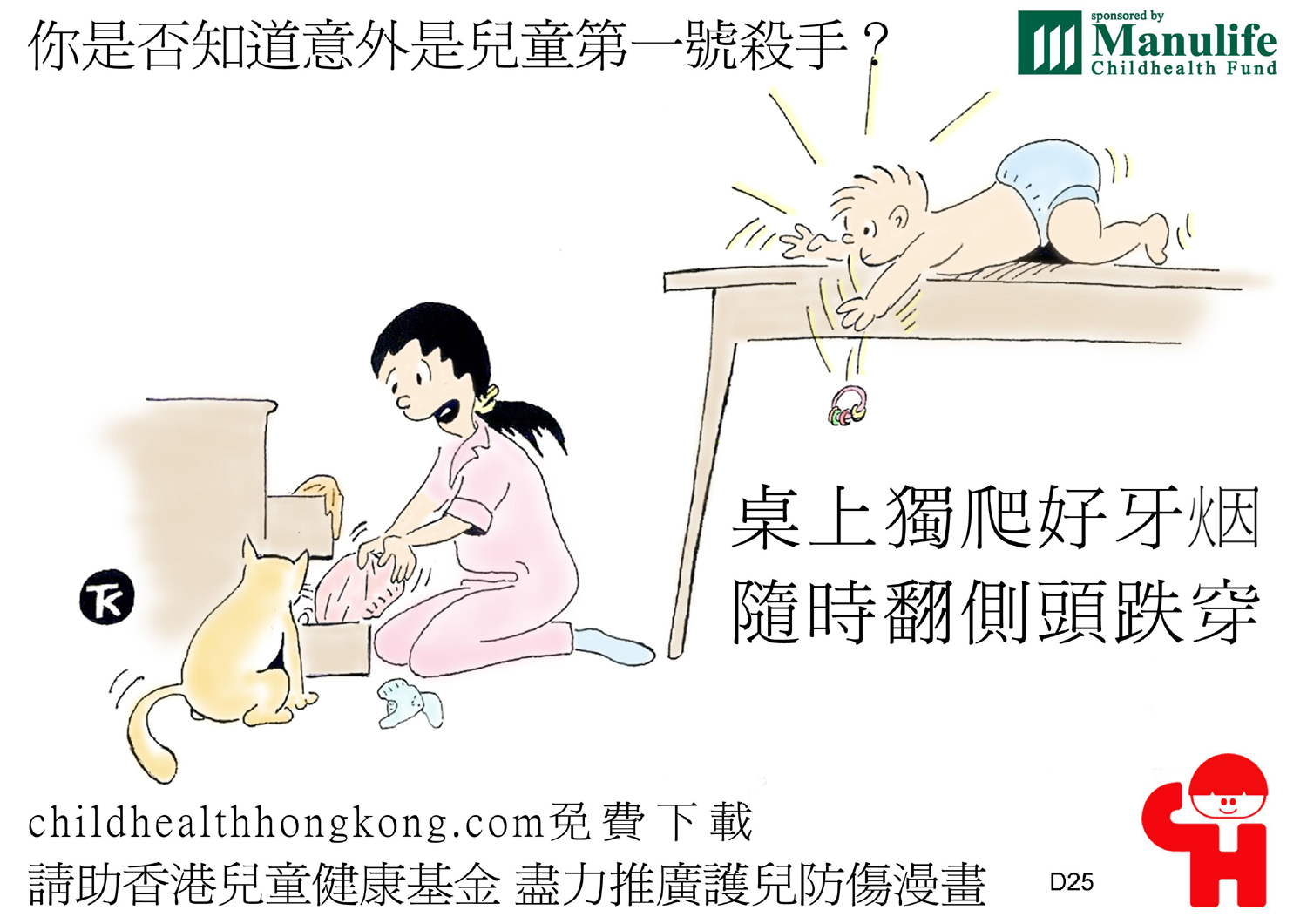 護兒防傷漫畫及宣傳口號 (桌上獨爬好牙煙, 隨時翻側頭跌穿)