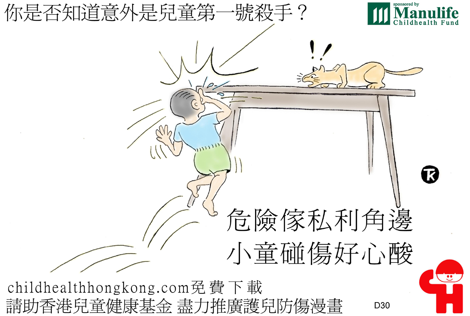 護兒防傷漫畫及宣傳口號 (危險傢俬利角邊, 小童碰傷好心酸)