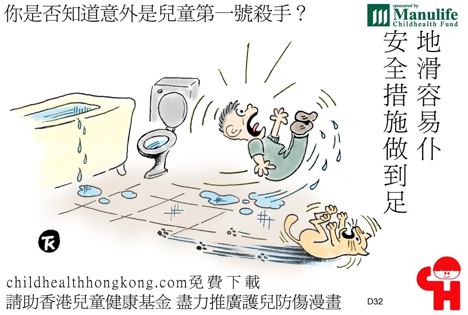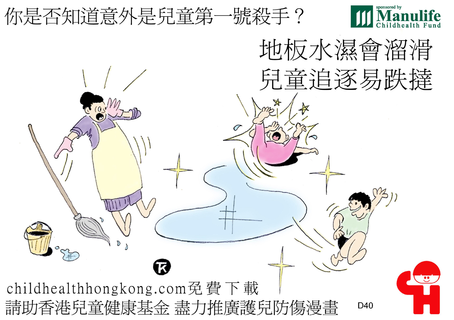 護兒防傷漫畫及宣傳口號 (地板水濕會溜滑, 兒童追逐易跌撻)
