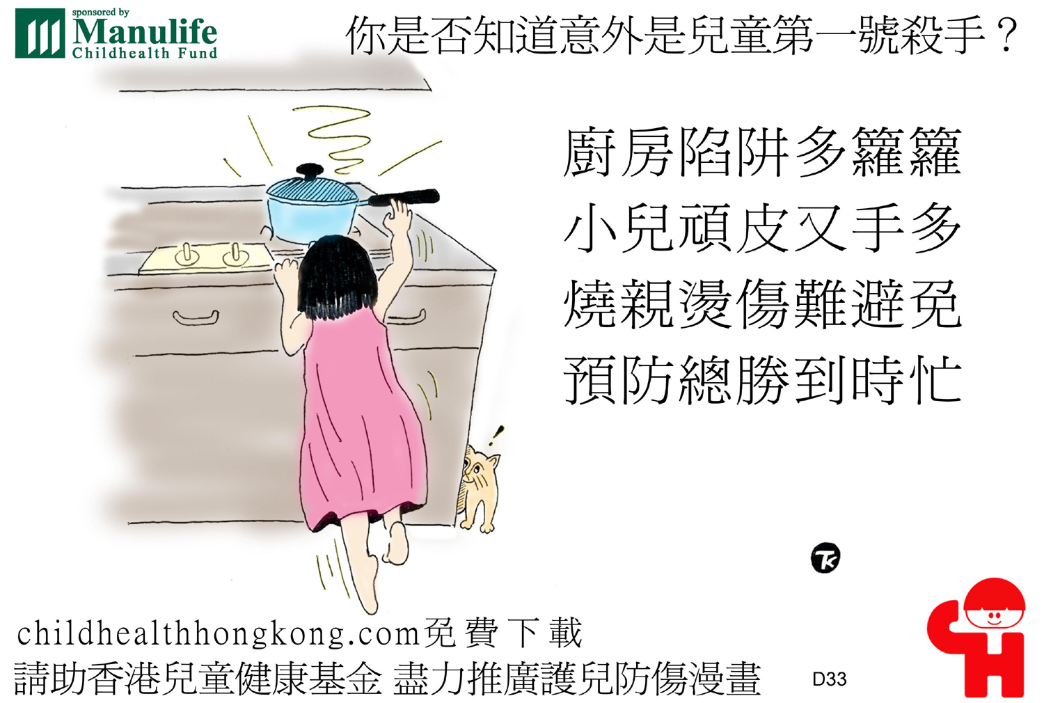 護兒防傷漫畫及宣傳口號 (滾水、火燄好危險,勿讓幼兒手去掂)