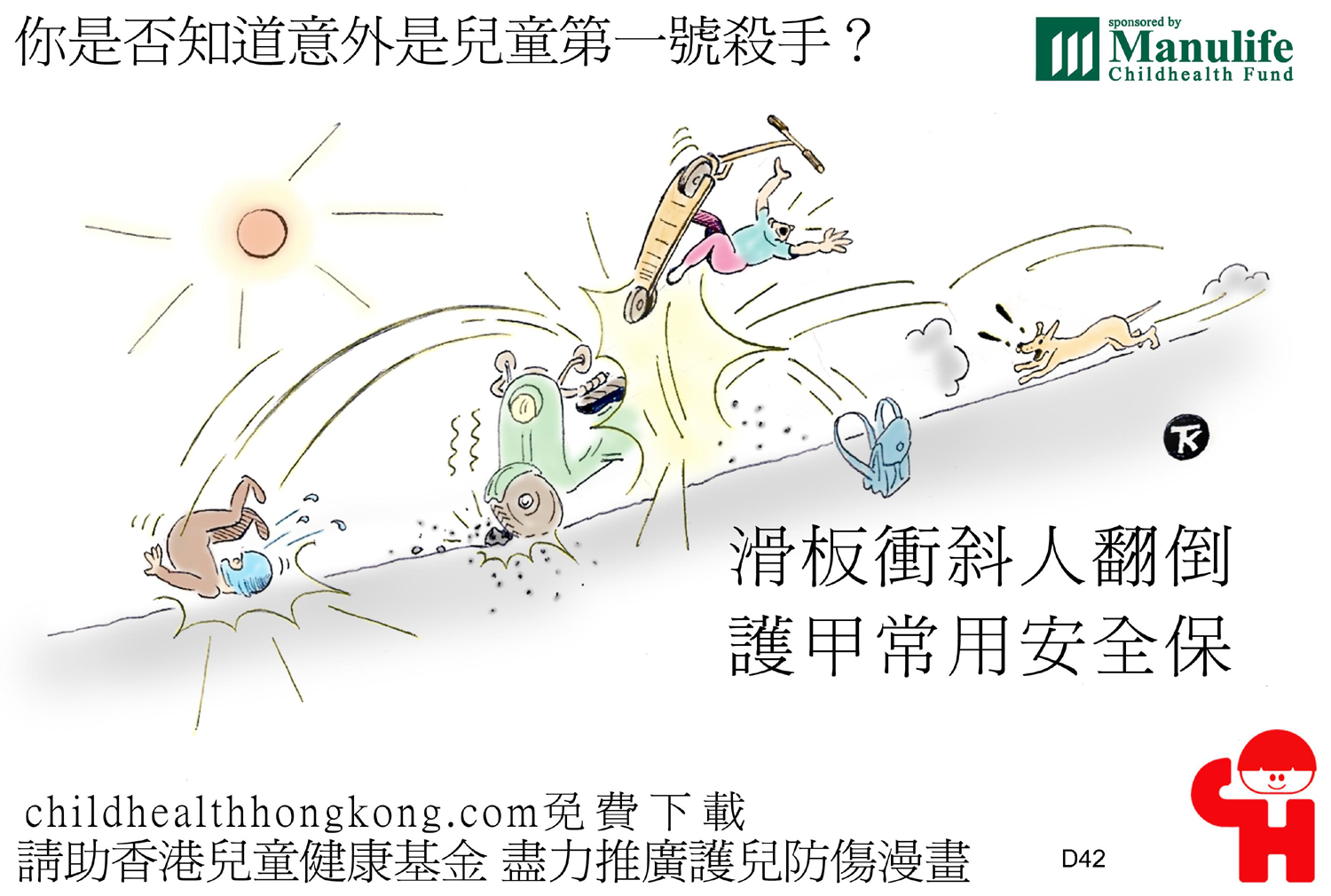 護兒防傷漫畫及宣傳口號 (滑板衝斜人翻倒 護甲常用安全保)
