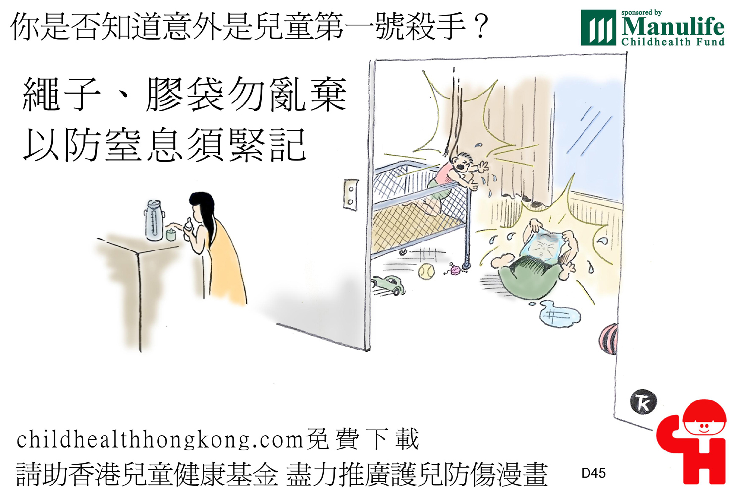 護兒防傷漫畫及宣傳口號 (繩子、膠袋勿亂棄,以防窒息須緊記)